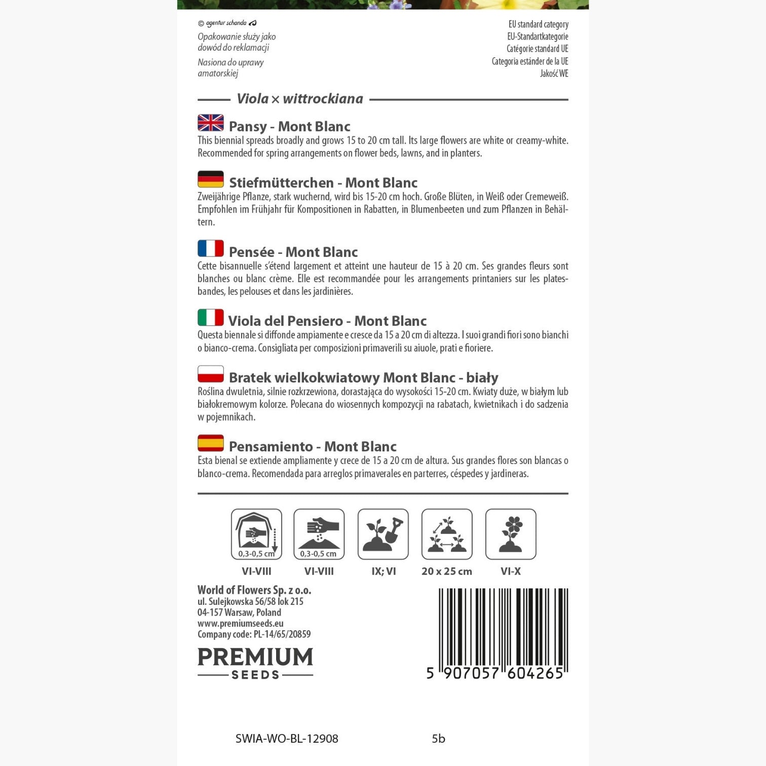 Appréciée pour son élégance sobre et sa floribondité remarquable, la pensée ‘Mont Blanc’ illumine les massifs et jardinières dès les premiers beaux jours. Cette bisannuelle se distingue par son port compact et tapissant, émaillé de larges fleurs immaculées, blanches ou délicatement crème, qui offrent une touche raffinée à tous les types d’aménagements, des plates-bandes traditionnelles aux compositions plus contemporaines.