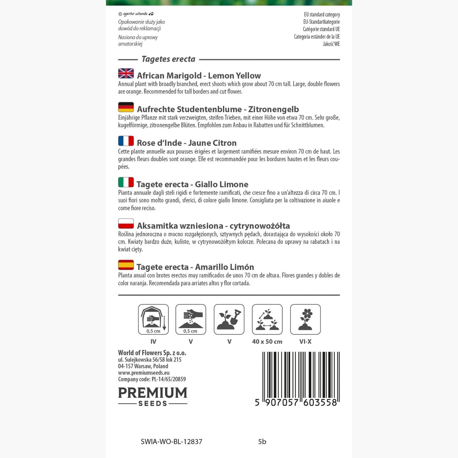 Le Tagetes erecta se développe en touffes dressées et bien ramifiées, atteignant généralement 70 cm de hauteur. Cette variété se caractérise par de grandes inflorescences doubles, formant de majestueuses sphères d’un jaune citron profond, légèrement nuancées d’orange à l’épanouissement complet. Par leur volume, ces fleurs apportent structure et couleur vive aux parterres, tout en exhalant un parfum typique, subtil et agréable. La rose d’Inde est particulièrement recommandée pour former des bordures hautes ou sublimer des bouquets de fleurs coupées grâce à sa longue tenue en vase.