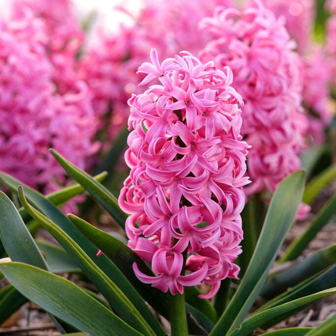 Dotée d’un port compact et dressé, la jacinthe Scarlet Pearl présente des hampes florales denses qui portent de nombreux bouquets étoilés. Le feuillage, composé de longues feuilles rubanées vert brillant, forme une touffe élégante à la base des tiges florales. Les inflorescences se distinguent par leur texture charnue et leur aspect soigné, conférant à l’ensemble un effet structuré tout en restant naturel. La silhouette harmonieuse de cette plante permet d’obtenir un rendu équilibré dans les compositions paysagères.