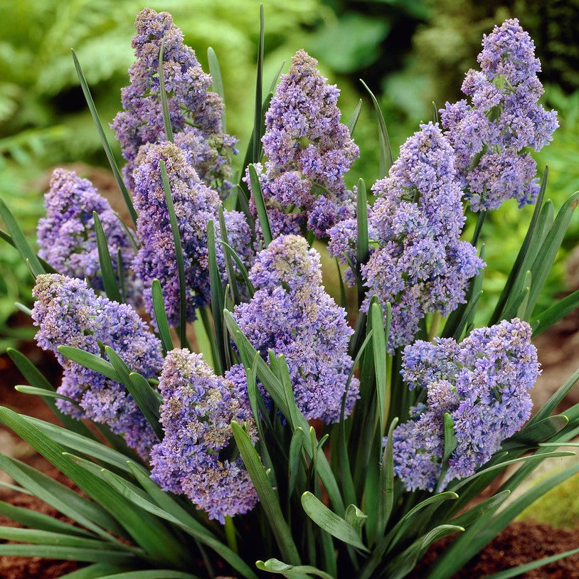 La floraison intervient au mois d’avril, apportant l’une des premières touches colorées du printemps alors que peu d’autres espèces sont encore écloses. Les épis violets émergent au-dessus du feuillage sur une hauteur de 15 à 20 cm, créant un effet dense et lumineux. Après la floraison, le feuillage persiste quelque temps avant de jaunir puis disparaître progressivement, laissant le bulbe entrer en repos jusqu’à la saison suivante.