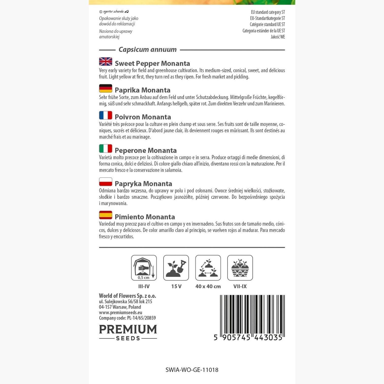 Découvrez la variété exceptionnelle de poivron Monanta (Capsicum annuum), un incontournable pour tout passionné de jardinage. Cette plante se distingue par ses fruits coniques de taille moyenne, qui passent d'un jaune clair éclatant à un rouge intense à maturité. Leur goût sucré et délicieux en fait un choix idéal pour le marché frais et le marinage, offrant des récoltes abondantes qui raviront vos papilles.