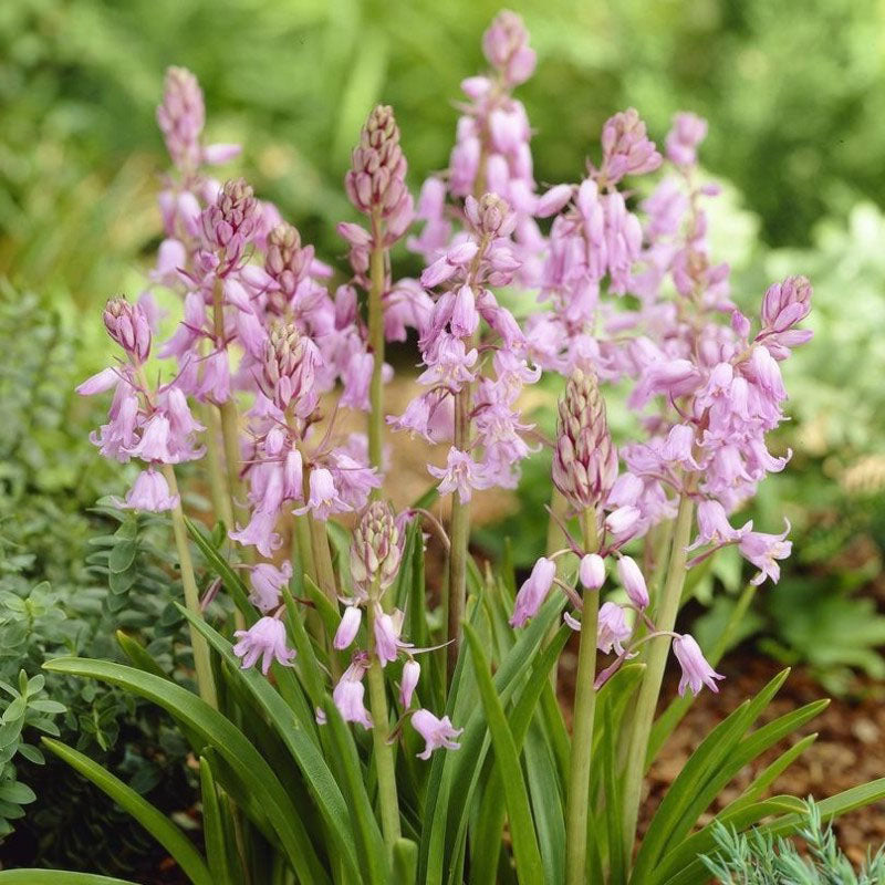 Dotée d’un port compact, la scille rose présente des tiges fines qui portent de petites fleurs en forme de clochettes, réunies en inflorescences serrées. Le feuillage, linéaire et brillant, accompagne harmonieusement la floraison en formant une touffe élégante à la base des hampes florales. Les pétales affichent une teinte rose douce qui contraste avec le vert vif du feuillage, créant un ensemble visuel équilibré et attrayant. La silhouette générale reste sobre mais structurée, idéale pour souligner le dessin d’un massif printanier.