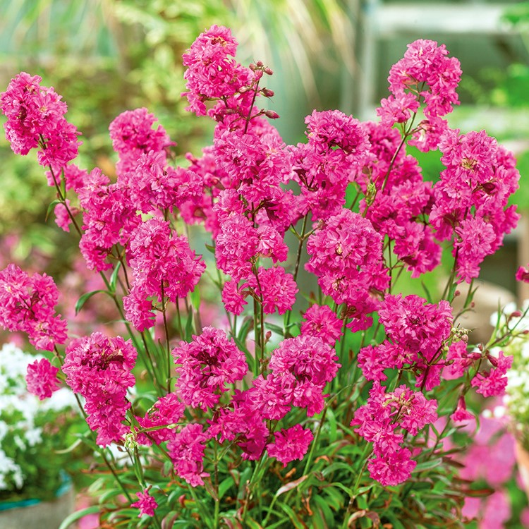 Le Silène visqueux (Lychnis viscaria) est une plante vivace élégante, mesurant entre 40 et 50 cm de hauteur, qui saura éblouir votre jardin avec ses charmantes touffes de feuilles herbeuses. Les majestueuses tiges de cette plante portent de splendides grappes de fleurs paniculées, qui peuvent être doubles ou simples, se parant de couleurs roses ou blanches. Elle est idéale pour agrémenter vos massifs de fleurs, orner vos rocailles ou réaliser des bouquets de fleurs coupées.