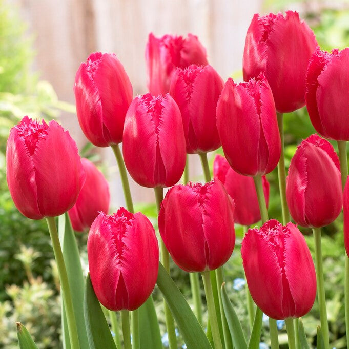Le port de cette tulipe est élancé et gracieux, porté par des tiges robustes qui mettent en valeur des fleurs aux pétales rouge rosé. Les bords subtilement dentelés de chaque fleur confèrent à l’ensemble un aspect délicatement ciselé, accentuant l’originalité de la variété. Le feuillage, d’un vert soutenu, forme un écrin sobre qui met en relief la vivacité des corolles. La texture satinée des pétales capte la lumière et anime le massif d’effets changeants sous la brise.