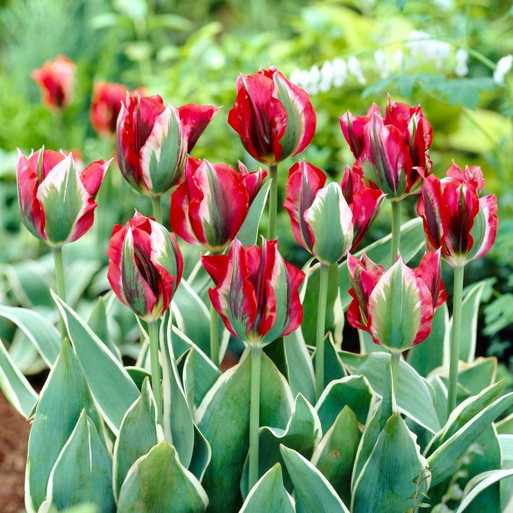 Sa morphologie révèle une silhouette élancée, portée par un feuillage vert vif agrémenté d’un liseré blanc qui souligne chaque feuille. Les fleurs, portées par des tiges robustes, affichent un duo de couleurs où le vert et le rouge se répondent harmonieusement, offrant ainsi un contraste saisissant au cœur du printemps. La texture satinée des pétales met en valeur les nuances éclatantes tandis que la tenue générale de la plante reste droite et équilibrée, même sous l’effet du vent ou des ondées printanières.