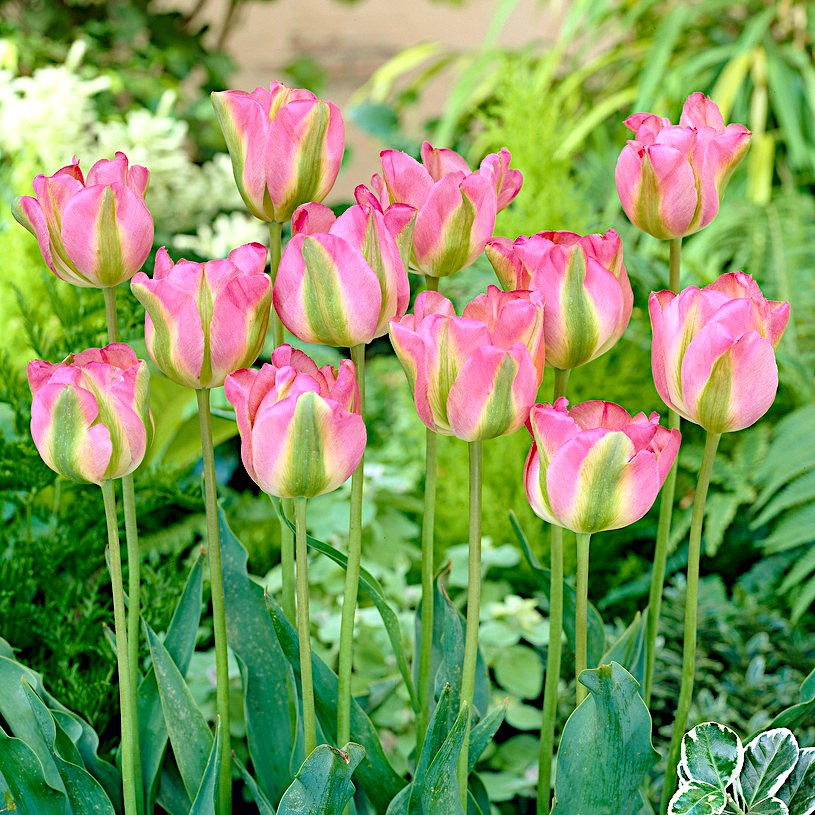 Dotée d’une silhouette élancée, la tulipe Greenland présente des tiges robustes qui portent des fleurs aux pétales bicolores, mêlant délicatement le rose et le vert. Son feuillage est composé de longues feuilles lisses, d’un vert soutenu, qui accompagnent harmonieusement la floraison. La texture satinée des pétales accentue l’élégance de chaque fleur, tandis que l’ensemble de la plante conserve une tenue droite et stable même sous les aléas du printemps.