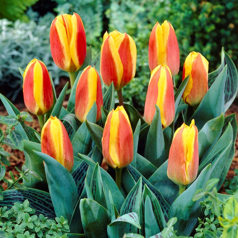 Dotée d’un port bas et dense, la tulipe Greigii red-yellow présente des tiges robustes qui supportent sans peine ses fleurs bicolores. Les pétales affichent une texture lisse et satinée, rehaussée par l’intensité des couleurs vives qui captent la lumière naturelle. Le feuillage, large et légèrement ondulé, forme un écrin vert franc autour de chaque tige florale, accentuant le contraste avec les corolles éclatantes. La silhouette reste compacte tout au long du développement végétatif, ce qui favorise un effet tapissant harmonieux en bordure ou en rocaille.