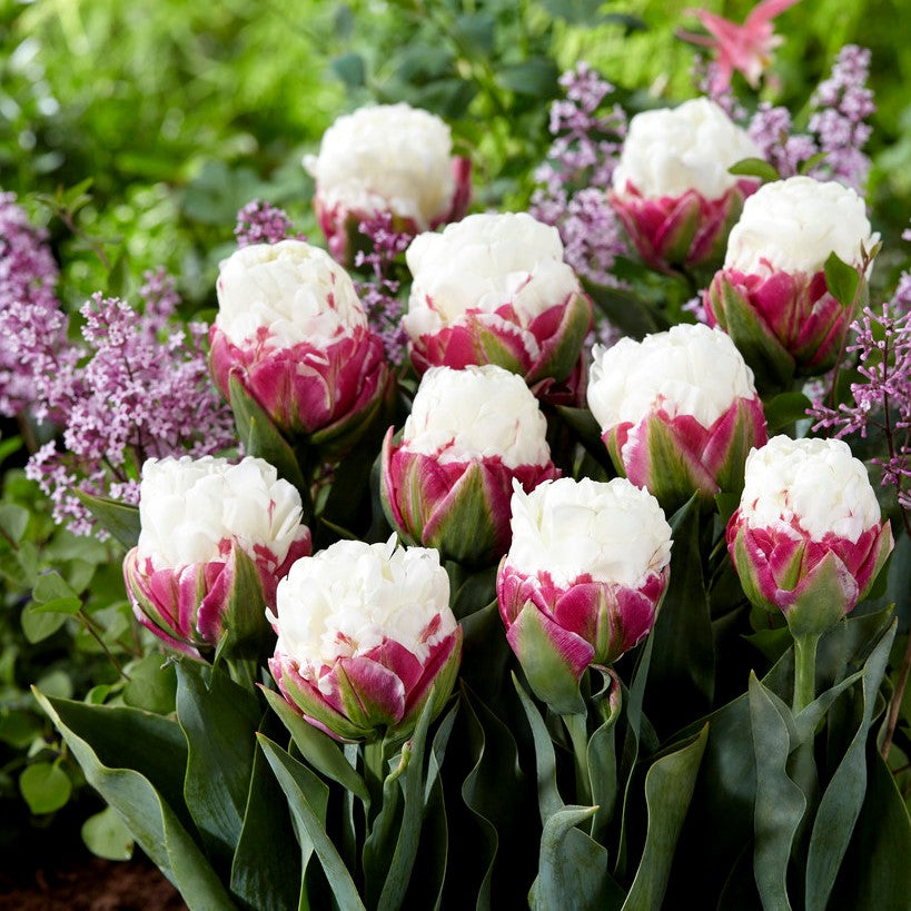 Son port élégant se traduit par une silhouette compacte, portée par des tiges fines qui mettent en valeur la structure généreuse de la fleur. Les pétales internes, d’un blanc éclatant, sont enveloppés par des pétales externes teintés de rose soutenu, évoquant l’aspect d’une coupe gourmande. Le feuillage vert franc accompagne discrètement la floraison sans jamais éclipser l’attrait visuel principal. L’ensemble offre un contraste subtil entre textures douces et volumes arrondis, renforçant le caractère précieux de cette tulipe.