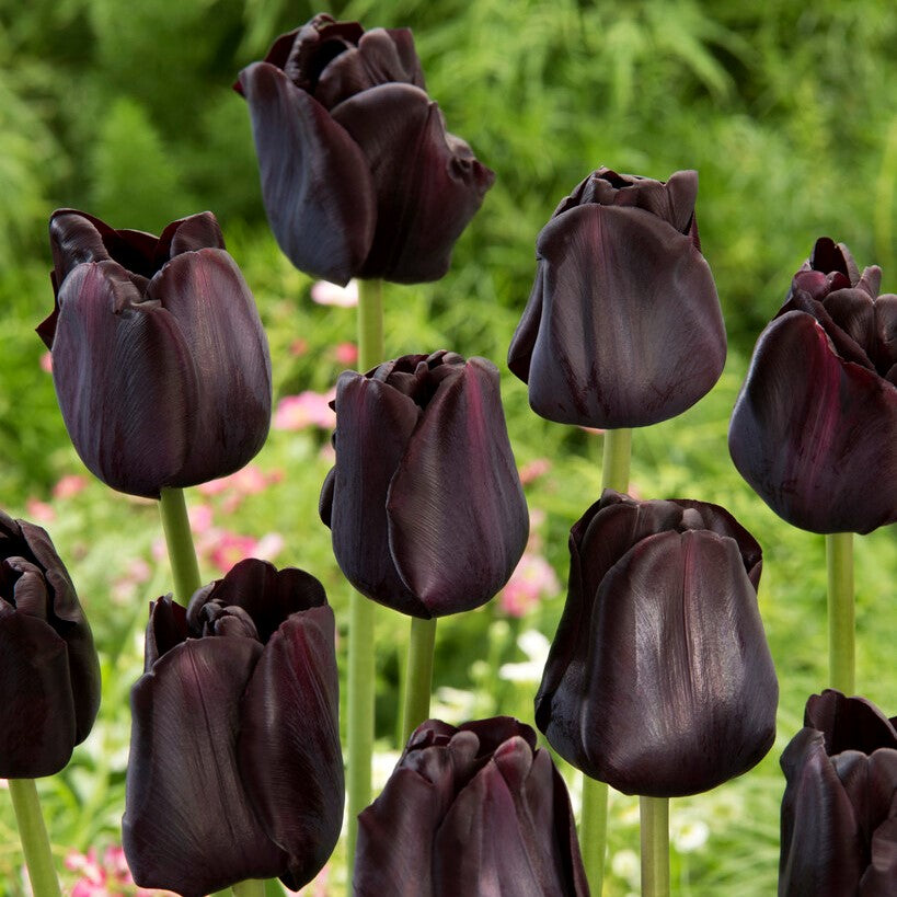 Son port élancé et sa silhouette droite offrent une allure structurée, tandis que ses fleurs présentent des pétales au violet très foncé, presque noir, qui captent immédiatement la lumière du printemps. Le feuillage vert franc accompagne la floraison sans excès de volume, mettant en valeur la pureté de chaque corolle. La texture lisse des pétales accentue la sobriété de cette variété, et les tiges robustes assurent une bonne tenue même lors de conditions venteuses ou pluvieuses.