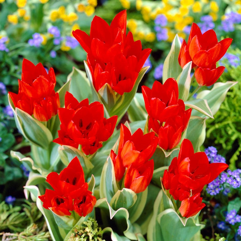 Dotée d’une silhouette compacte, la tulipe Praestans Unicum se distingue par un feuillage vert vif marginé d’un liseré blanc qui souligne chaque feuille avec élégance. Les tiges robustes portent des fleurs rouges intenses, formant une corolle généreuse au cœur du printemps. L’ensemble offre une texture contrastée entre la douceur du feuillage panaché et la vivacité des pétales, créant un effet visuel marquant sans jamais alourdir l’ensemble du parterre ou du contenant dans lequel elle est installée.