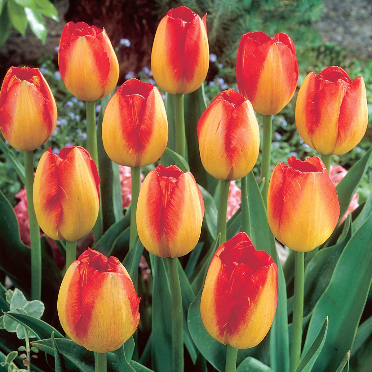 Dotée d’une silhouette élancée, la tulipe Prins Claus présente de grandes fleurs portées par des tiges robustes qui assurent une bonne tenue au vent. Le feuillage, d’un vert soutenu, offre un contraste discret avec les pétales éclatants, accentuant la présence de chaque fleur dans le massif. Les corolles dévoilent des nuances intenses d’orange et de jaune, apportant relief et profondeur à l’ensemble. L’aspect général reste harmonieux grâce à un port droit et régulier qui met en valeur la structure du groupe.