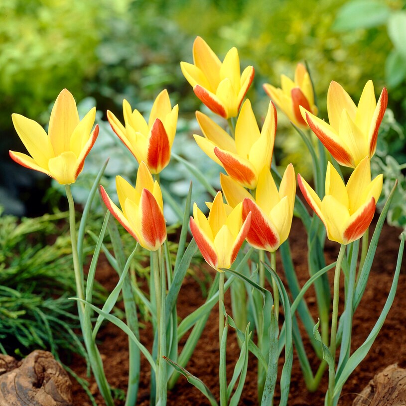 Le port de la tulipe Tinka est compact et élégant, avec des tiges droites portant chacune une fleur bien formée. Les pétales affichent un contraste marqué entre le jaune et le rouge, créant un effet visuel dynamique au sein des massifs. Le feuillage, fin et allongé, accompagne discrètement la floraison sans alourdir l’ensemble. L’allure générale de cette plante reste sobre tout en offrant une présence colorée appréciable dans les compositions naturelles ou traditionnelles.